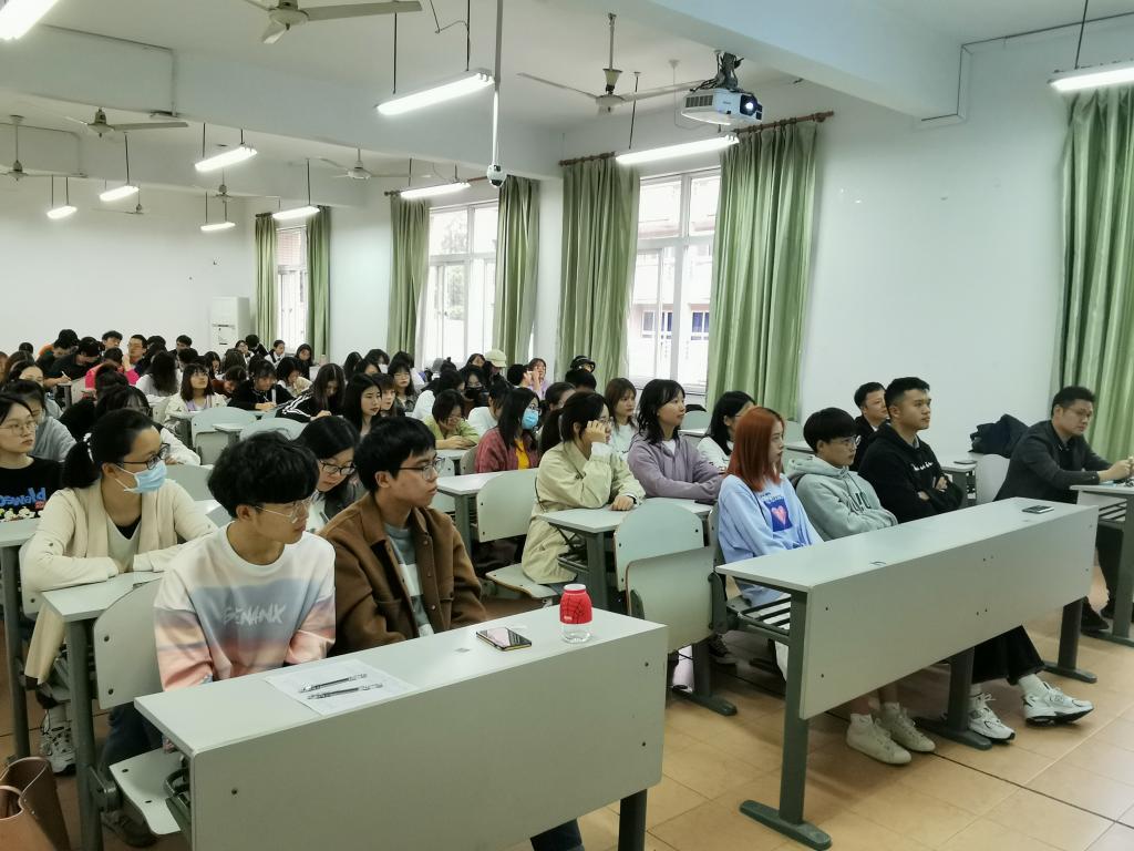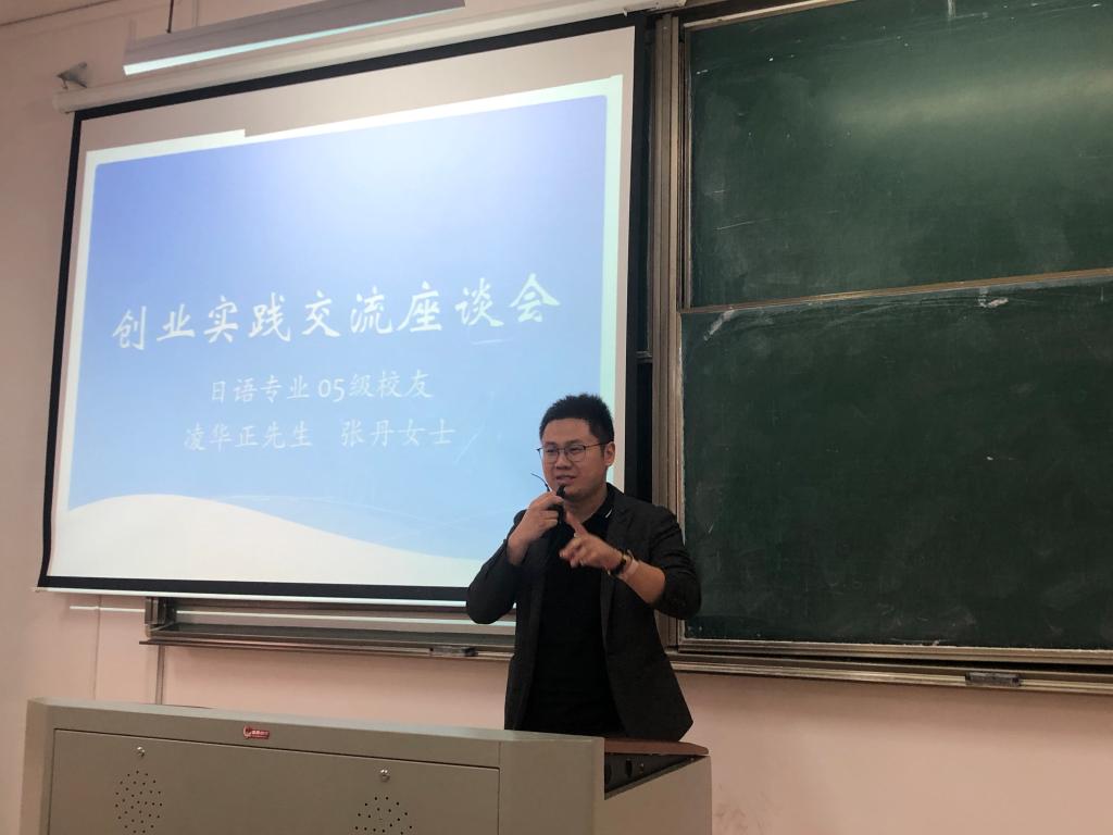 10月17日,91论坛 在教一303举行日语专业校友创业实践交流会,日语专业05级的两位校友向在座的同学们分享了他们创业实践经历。交流会由日语系教研室主任朱京哲老师主持,日语系主任刘韵超老师、91论坛 教务办主任王玉娇老师出席,来自全院日语专业各年级的100余名学生聆听了讲座。