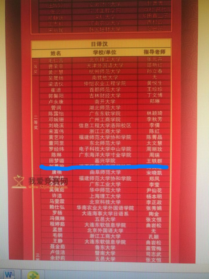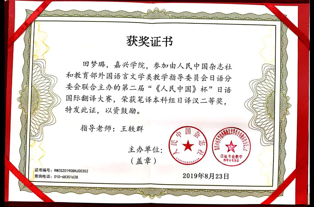 经过一个多月紧张和激烈的选拔,8月12日,所有奖项获得者最终揭晓。经过王轶群博士的认真指导,我院日语专业田梦璐同学与南开大学和浙江工商大学等高校学子并列荣获本科组日译汉二等奖。