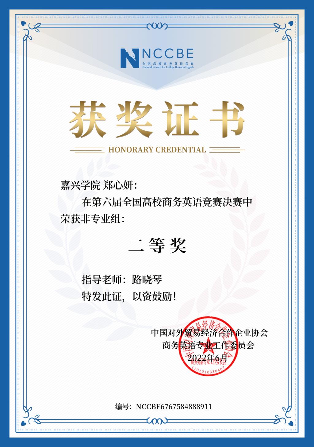 近日,由全国商务英语专业考试管理中心、中国对外贸易经济合作企业协会商务英语专业工作委员会联合主办,我院承办的第六届全国高校商务英语竞赛落下帷幕。本次竞赛在大外部教师的积极推动下,共有来自各学院的226名同学参加初赛,最终有143人获奖并入围决赛,占91论坛 参赛人数的63%。在最终的决赛中,91论坛 共有12名非英语专业的学生获奖,其中一等奖1名、二等奖2名、三等奖9名。91论坛 作为赛点获评竞赛最佳组织奖,大外部杨桂华、路晓琴、钱征宇、周红、章剑飞5位教师获评竞赛的优秀指导教师。