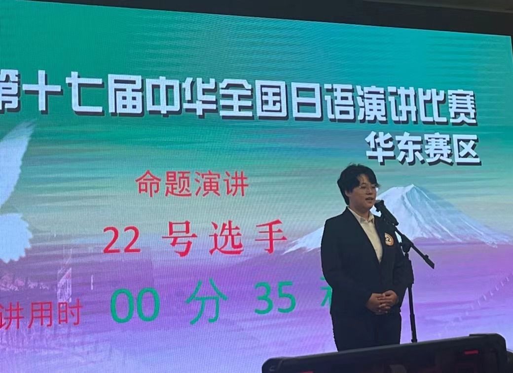今年这项赛事汇集了全国各高校日语专业的优秀选手,级别高且难度大。张文馨同学在王雪老师的指导下,认真打磨演讲内容,反复练习日语发音,顺利通过预赛,与复旦大学和上海外国语大学等知名高校的31名选手入围决赛。决赛分“命题演讲”和“即兴演讲”两部分,各校高手竞相角逐,比赛异常激烈。张文馨同学虽倍感压力,高度紧张,但最终凭借平日里苦练和扎实的日语实力,顺利完成了两个环节的演讲,赢得了评委的认可。