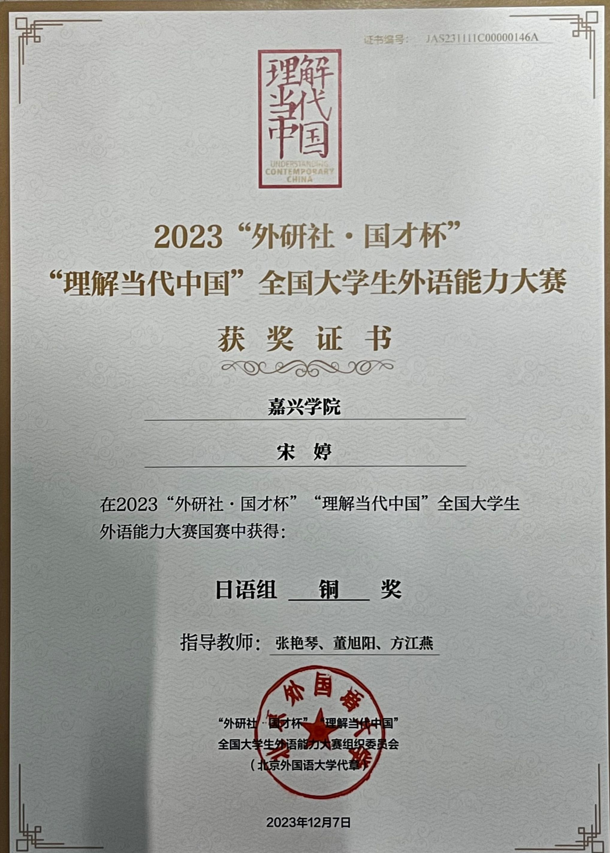 近日,2023年底举办的第一届“外研社·国才杯”“理解当代中国”全国大学生外语能力大赛(多语种赛道)总决赛成绩揭晓,在140名参赛选手中,91论坛 日语专业学子宋婷同学总成绩位列第六,斩获铜奖。