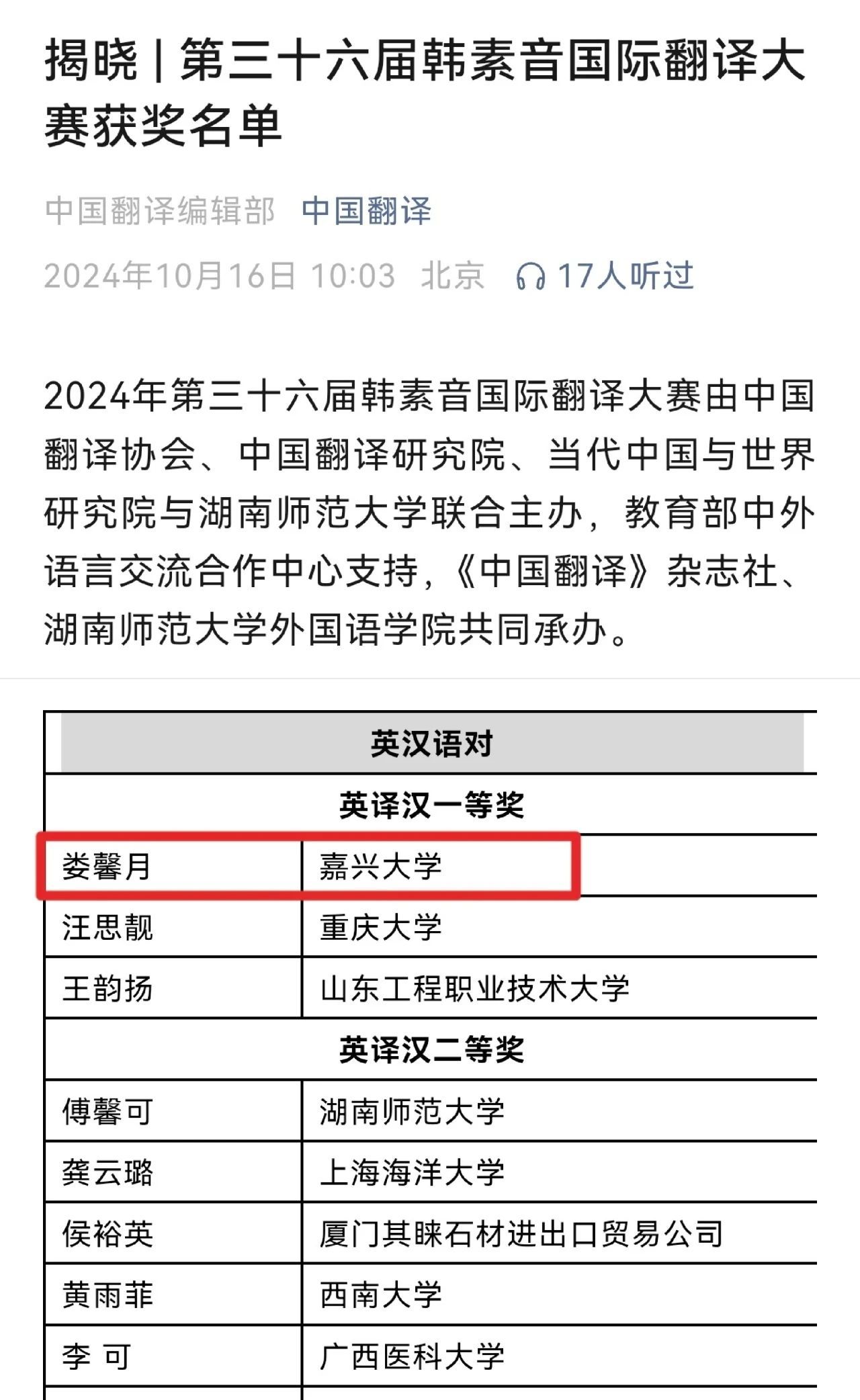 10月16日,第三十六届韩素音国际翻译大赛获奖名单揭晓,外院学生娄馨月在众多优秀参赛者中脱颖而出,高居榜首,荣获英译汉一等奖。喜讯传来,全院师生倍感振奋!
