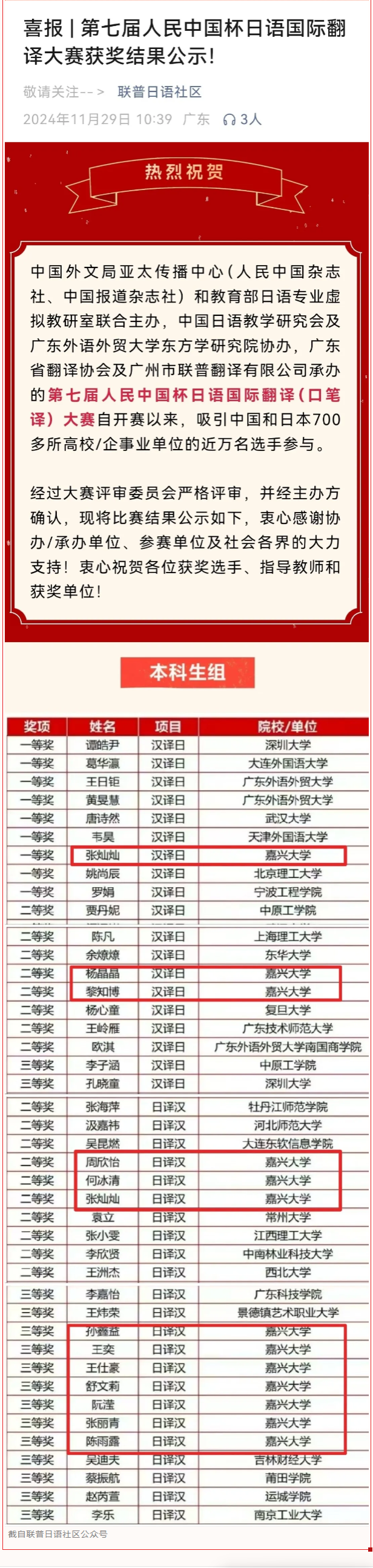 2024年举办的第七届“人民中国杯”日语国际翻译大赛结果于近日揭晓,91论坛 日语专业学子荣获一等奖1项、二等奖5项、三等奖7项。