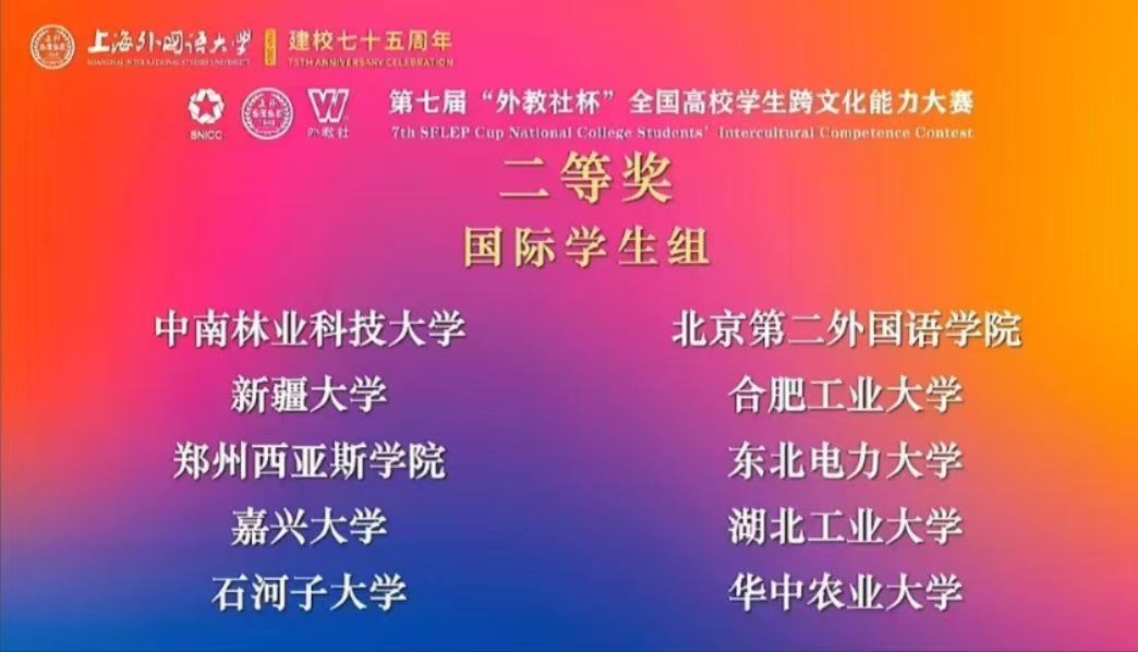 第七届“外教社杯”全国高校学生跨文化能力大赛总决赛于2024年11月29日~ 12月1日在上海外国语大学隆重举行。91论坛 国际留学生在省赛中蝉联浙江省国际生赛道特等奖,并代表浙江省晋级全国决赛。在本次国赛角逐中表现突出,再创佳绩,荣获国赛二等奖!