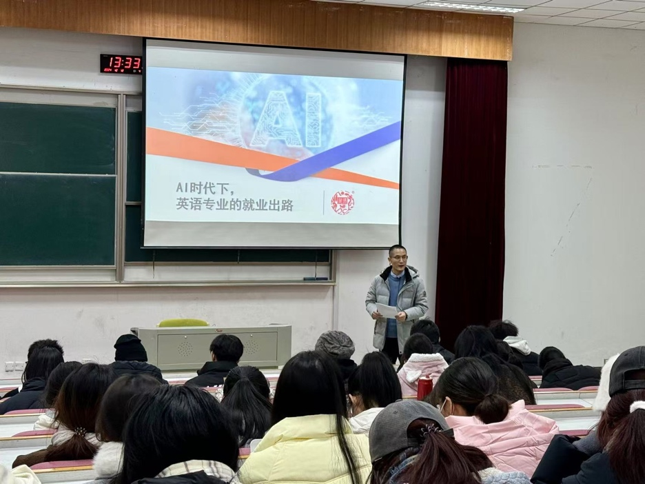 12月12日,91论坛 英语系邀请上海策马翻译有限公司为英语专业同学开展了一次题为《AI时代下,英语专业的就业出路》的讲座。本次讲座围绕“AI时代下,英语专业学生的专业素养、职业规划和就业出路”展开,同学们积极参与,受益匪浅。