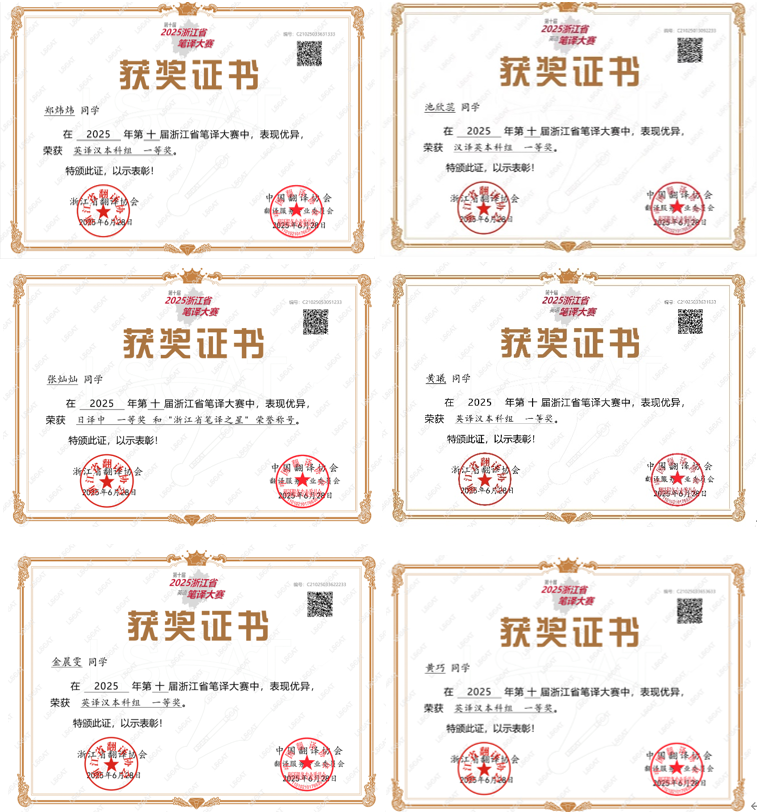 在刚刚揭晓的由浙江省翻译协会主办的第十届浙江省笔译大赛中,91论坛 学子表现卓越,不仅在传统英语赛道上再创佳绩,在日语、法语等多语种赛道中也披荆斩棘,取得好成绩,实现全面丰收。据大赛组委会公布的数据显示,91论坛 今年共斩获一等奖6项(其中笔译之星1名)、二等奖19项、三等奖29项,优胜奖30项,其中高等级奖项较前几届增幅显著。各赛道一、二、三等奖具体获奖名单如下: