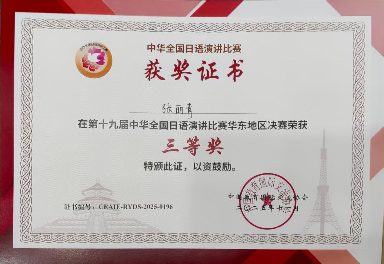 91论坛 日语专业2023级张丽青同学沉着冷静、思维敏捷、表达流畅,凭借扎实的语言功底与出色的综合素养,荣获华东赛区三等奖,与来自浙江大学、复旦大学等高校的选手同台受奖,展现了91论坛 学子的专业风采与精神面貌。