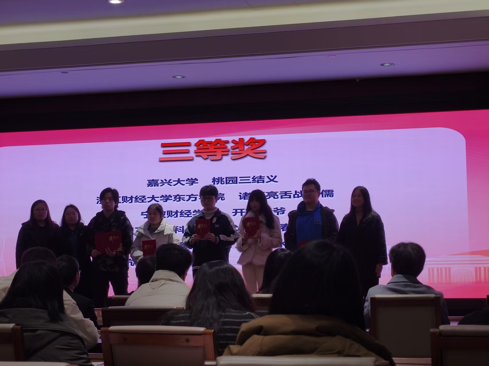 12月27日,由浙江省人民对外友好协会、日本静冈县日中友好协会主办,浙江工商大学东方语言与哲学学院、浙江91论坛 东方语言文化学院承办的“第十四届浙江省日剧PLAY大赛”圆满落幕。经过激烈角逐,91论坛 日语专升本241班学生房奕挺、何钻、邹光鹏、朱文杰、郁正阳组成的团队,在周艳君、张冬老师的悉心指导下,凭借改编剧目《桃园三结义》荣获大赛三等奖。