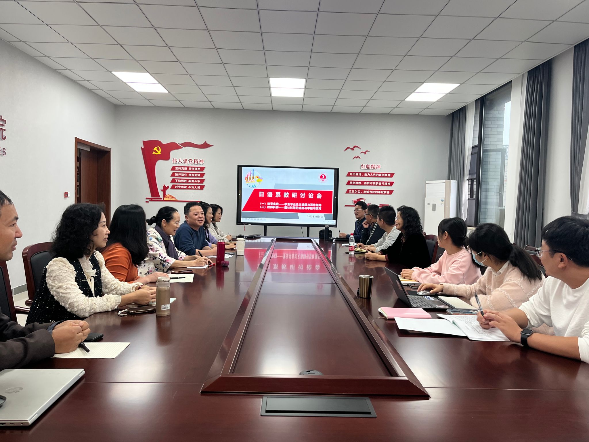 教师的科研水平是一个专业发展的重要指标。近几年,日语专业教师的科研有了长足进步,先后获得省部级科研项目3项,市厅级项目6项,还有1项获得了副省级领导批示,出版专著和译著6部,发表SSCI等高水平论文14篇。为了夯实专业实力,进一步提升教师科研水平,教研活动的第二个内容是“提升教师科研实力”。专业负责人郭永恩就接下来的教师科研做了安排,他希望老师们认真打磨并尽快完成各类课题的申报书,学院将请一些获得国家社科基金项目、国家社科学术外译项目的国内学者和今年获得教育部社科基金项目的日语专业博士周艳君老师做科研辅导,力争老师门在科研上再有突破。