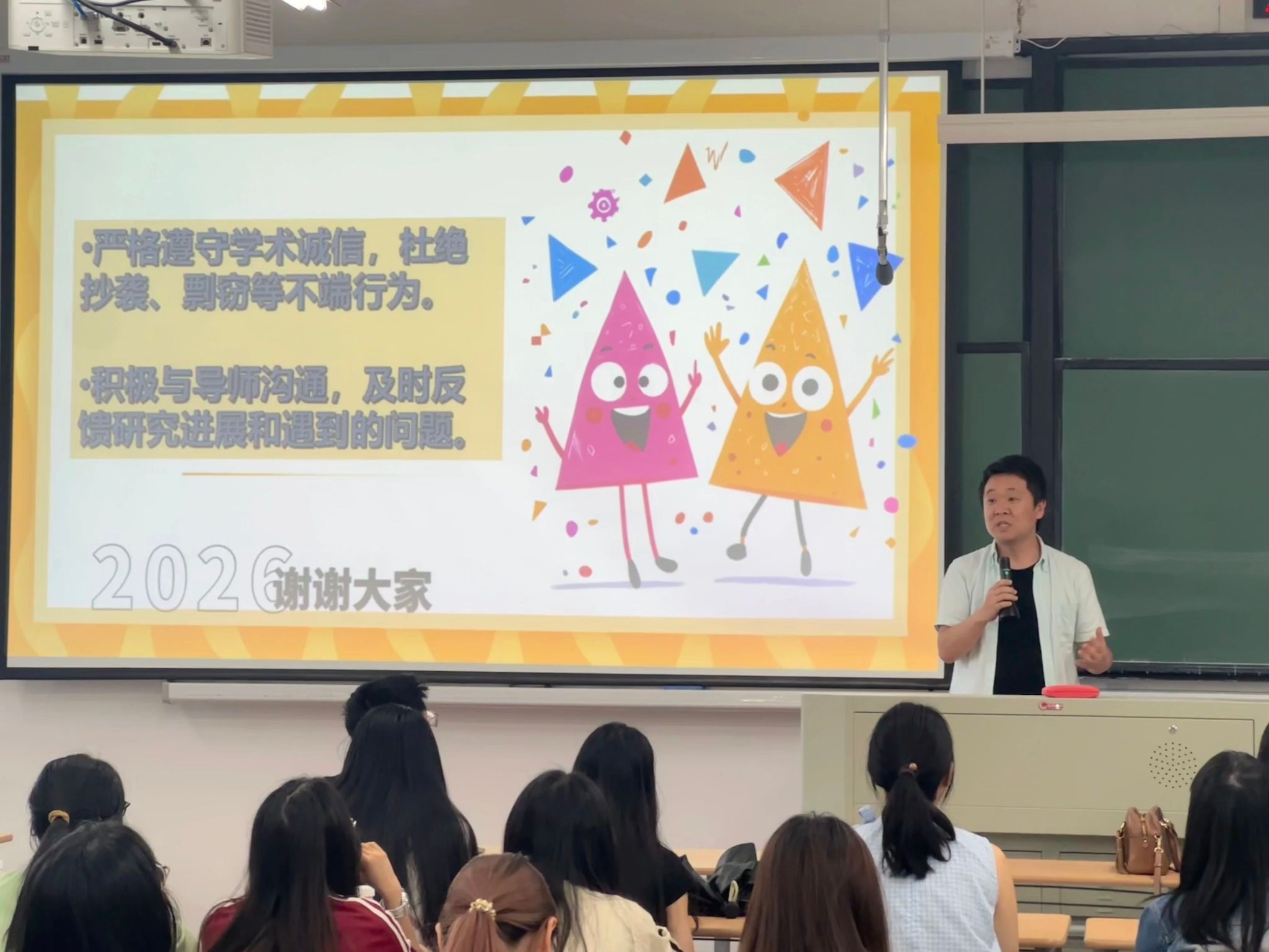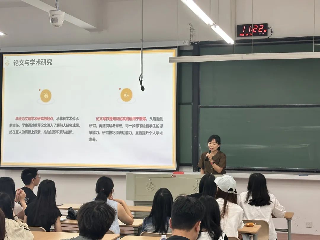 日语系主任王雪老师首先向同学们阐释了毕业论文的重要意义,强调了学术诚信的重要性,警示同学们杜绝抄袭剽窃AI代写等行为,希望同学们树立严谨的治学态度,独立完成各项研究任务,为未来学习和工作打下坚实基础。
