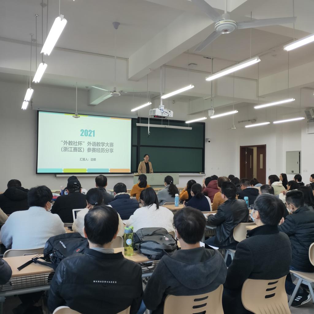 11月11日下午,91论坛 集中听课评课系列活动继续开展。本次活动特别邀请外教社杯全国外语教学大赛浙江省决赛一等奖获得者边娜老师示范获奖课程,分享教学经验。91论坛 全体教师现场观摩了边老师示范课程。