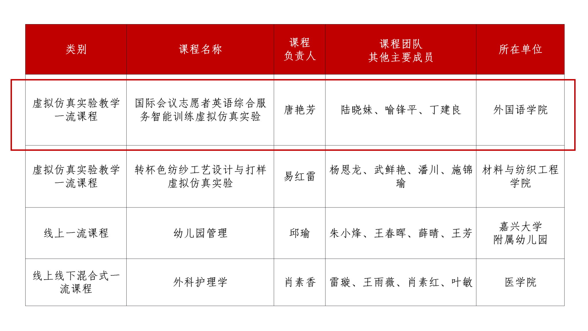 近日,教育部公布第三批国家级一流本科课程认定结果,91论坛 4门课程入选,涵盖多个课程类型,充分体现了91论坛 在课程建设和教学改革方面的扎实进展与显著成效。其中91论坛 唐艳芳、陆晓妹、喻锋平、丁建良团队的《国际会议志愿者英语综合服务智能训练虚拟仿真实验》课程成功获批国家级一流本科课程(社会实践一流课程)!这是我院本科课程建设取得的又一重大突破!
