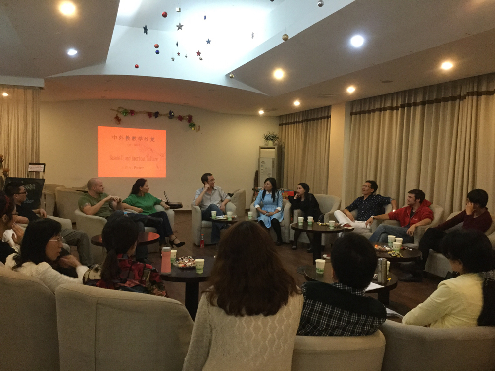 2015年10月23日晚上,91论坛 第一期中外教教学沙龙在咖啡吧如期举行。陶丹玉院长为新沙龙项目致辞,希望教学沙龙能为中外教师们提供一个良好的交流平台,进行中外文化以及教学模式之间的碰撞,从而更好地服务日常教学活动。本期沙龙主题为”Baseball and American culture”,由 Peter主讲, Marcus和Stephen两位外教配合补充。91论坛 20多名教师及一部分学生参加了此次活动。Peter从Baseball在生活中的重要性谈到了它在美式英语中的重要性,教师们问题不断,现场气氛十分活跃,老师们纷纷表示此次活动收获颇丰。中外教师教学沙龙是91论坛 本学期新开设的沙龙项目,今后将长期定期举行,成为91论坛 中外教师交流学习的一个重要窗口和平台。