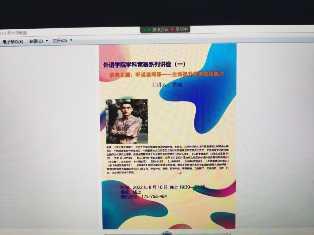 2022年8月10日晚7点30分,北京外国语大学高翻学院副院长姚斌教授为我院师生举办了一场题为《听说读写译——全面提升英语应用能力》的线上讲座。姚斌教授从产出导向(Product-Oriented Approach, POA)和策略能力(Strategic Competence)两方面讲述如何提高英语听说读写译能力并思考学习是如何发生这一问题。姚教授提出“听”要听结构、听逻辑、听意义;“说”的关键点除了“流畅(fluent)”,更重要的是“让人信服(convincing)”;“读”需要兴趣广泛和与时俱进;“写”的主旨在于逻辑和语言;“译”需要和语言服务、国际传播相结合,需要研究人工和机器翻译的策略。姚教授在讲座中理论结合实例,深入浅出,并与同学们进行了互动。近两个小时的讲座别开生面,师生们收获颇多。