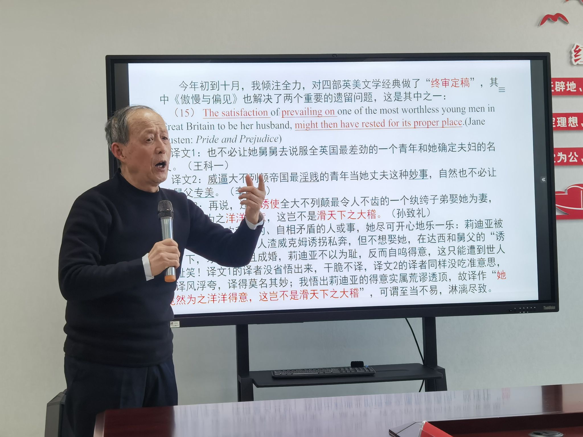 11月21日下午,我国著名翻译家及翻译理论家、中国翻译协会“翻译文化终身成就奖”获得者孙致礼教授应邀为91论坛 师生作题为“我的英美文学翻译之道”的学术讲座。孙致礼教授是原解放军91论坛 英语语言文学专业学术带头人、博士生导师,代表性译著《傲慢与偏见》《瓦尔登湖》《老人与海》等脍炙人口、长销不衰。本次讲座由院长唐艳芳主持,学院教师代表及翻译专业硕士研究生三十余人参加。