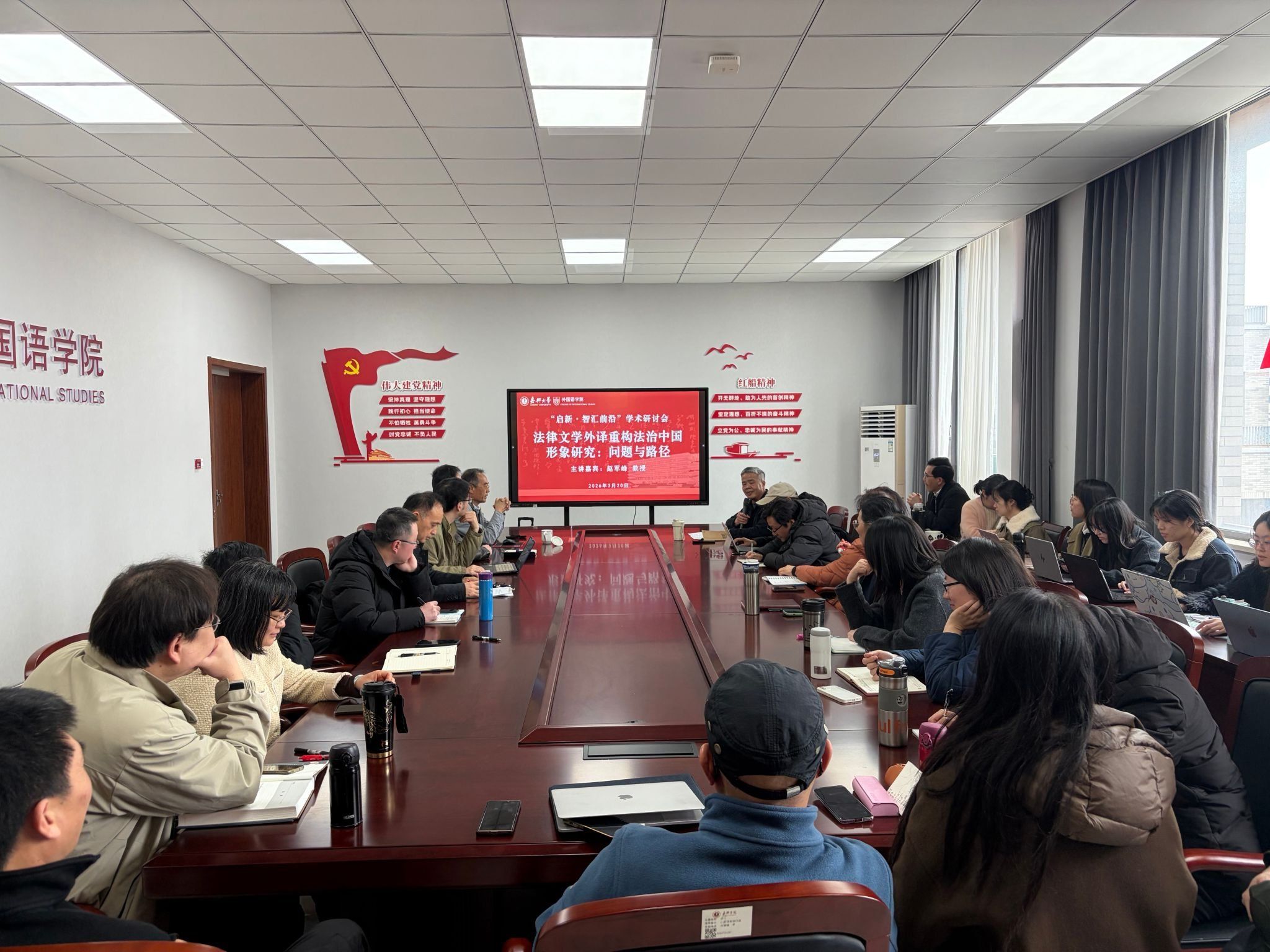 讲座伊始,赵军峰教授依托其主持的国家社科基金项目“中国法律文学经典外译与传播研究”的深厚积淀,从跨学科变革与创新意识的双重视角出发,深刻剖析了法治话语对外传播在塑造中国法治国家形象中的战略使命。