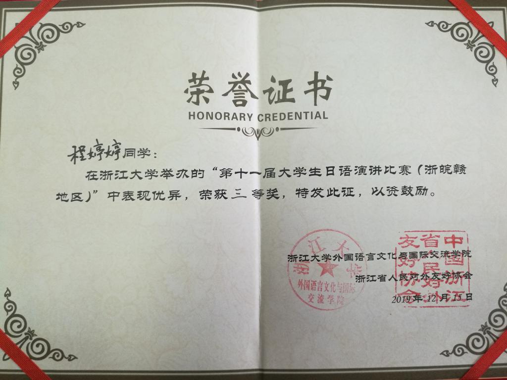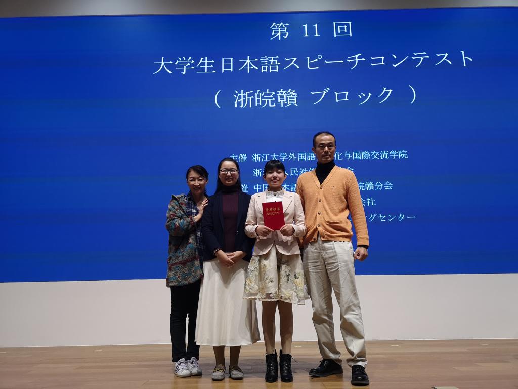 在33名选手的激烈角逐中,在刘韵超和外教桥川夫妻三位老师的细心指导下,我院日语专业学子程婷婷同学过关斩将,晋级决赛。在决赛的22名选手中,程婷婷同学的“命题演讲”题目是『あなたは、あなたであればいい』(“做你自己”),讲述了她留学日本秋田大学时的一个小故事。故事虽小,但使她从中获取了挑战困难的极大勇气。故事娓娓动听,拨动了听众和评委老师们的情感琴弦,感人至深。在接下来的“即兴演讲”和“回答问题”阶段,程婷婷同学沉着冷静。尤在“回答问题”环节中,她思维敏捷,条理清晰,对答如流,获得了在场听众的阵阵欢笑和热烈的掌声。最终,她与宁波大学、浙江工业大学、江西师范大学和浙江91论坛 等高校的选手收获了三等奖。
