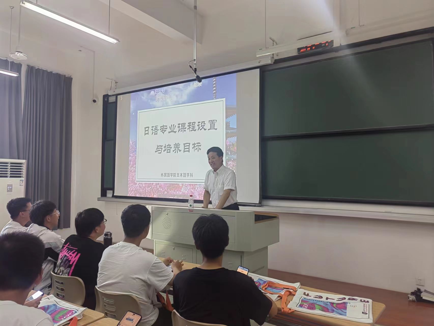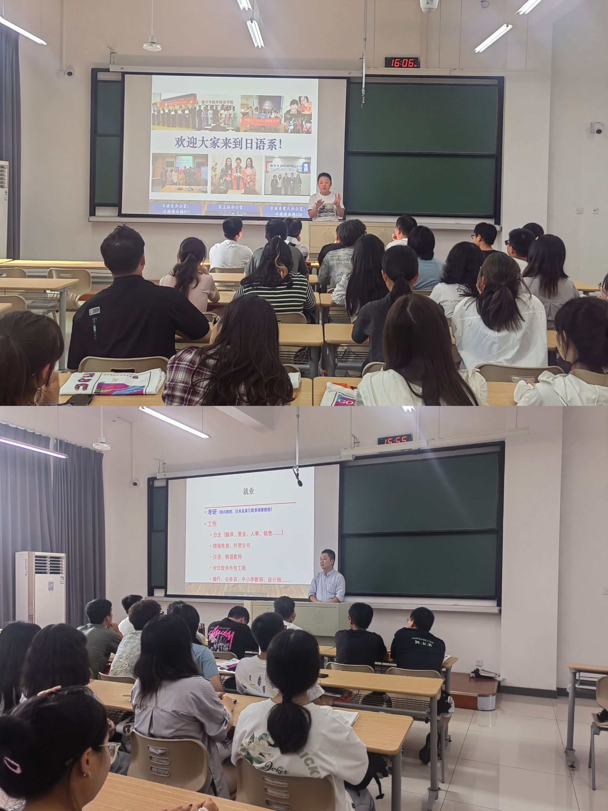 见面会最后,朱京哲和董旭阳两位老师分别就韩语方向和对日商贸方向做了简要的介绍,董旭阳老师还专就日语专业的毕业就业去向进行了说明,他期待同学们在大学四年中,积极投身社会实践,做一个对社会有用的外语人。