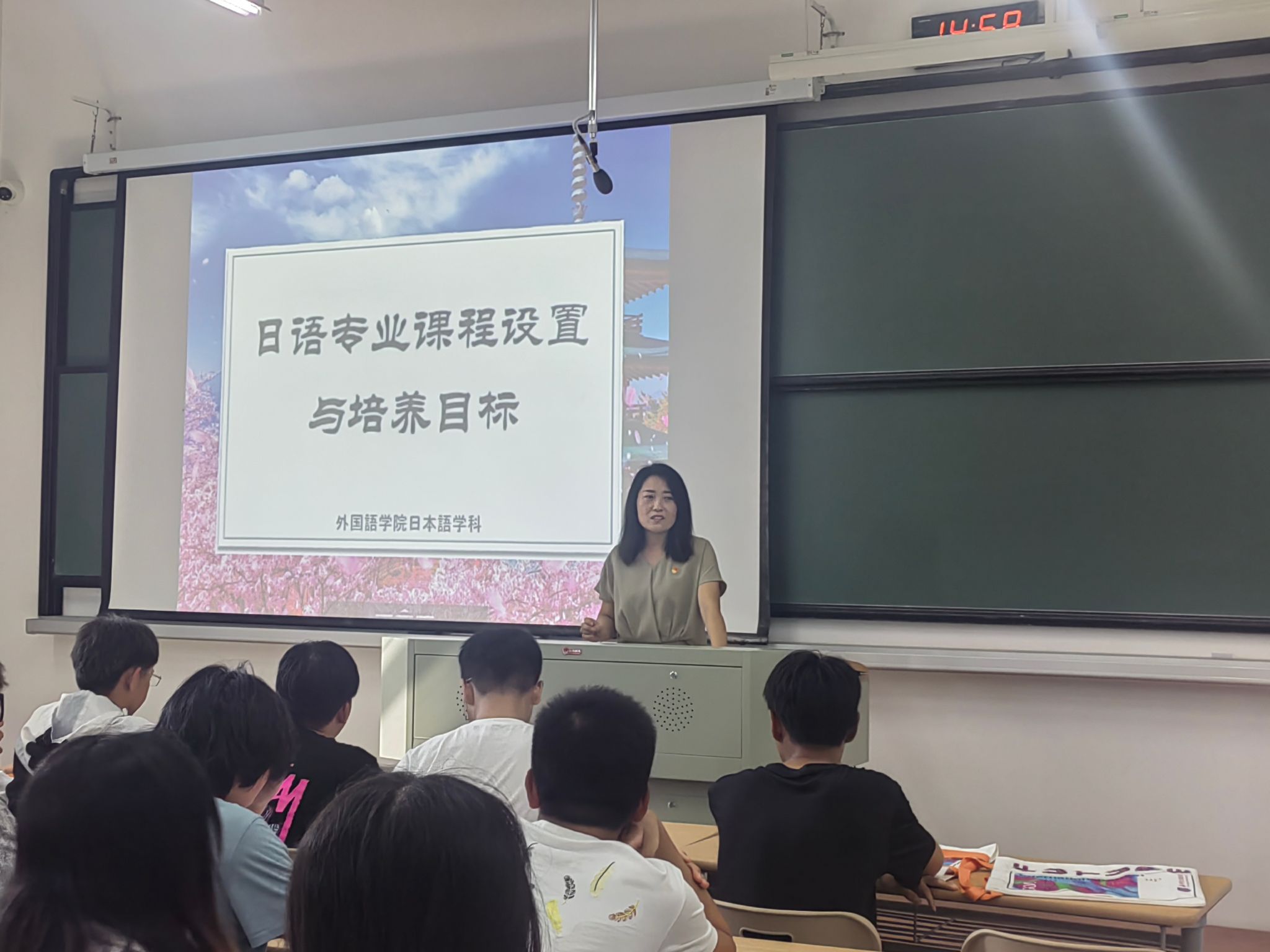 接着,张艳琴老师详细介绍了专业基础课等五个模块的课程设置。之后,她通过视频向同学们展示了日语专业的学长们在浙江省日语演剧大赛中的优秀表现,还连线正在日本和韩国留学的多位学长,请他们面对新生讲述多姿多彩的留学生活,也请了毕业后的学长谈就职后的心得等。张老师鼓励新同学们不仅要在课堂上学习语言,还要参加丰富多彩的课外活动,以此深入了解日本文化,提升跨文化交际能力。