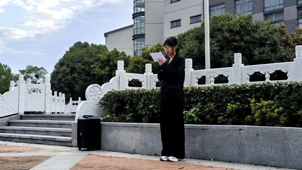 英语222班的王艺颖同学作为学生代表在国旗下讲话,她表达了对新中国成立75周年、学校办学110周年校庆的祝福,呼吁2024级新同学要肩负起新时代外院青年的责任与使命,不仅要掌握语言技能,不断拓宽国际视野,增进对不同文化的理解和尊重,为促进文化交流和国际合作发挥积极作用,更要以国旗为荣,以国家为傲,积极投身于专业学习和社会实践中,不断提升自我综合素养,充分展现出新时代外院学子的风采 为实现中华民族伟大复兴的中国梦贡献青春力量。