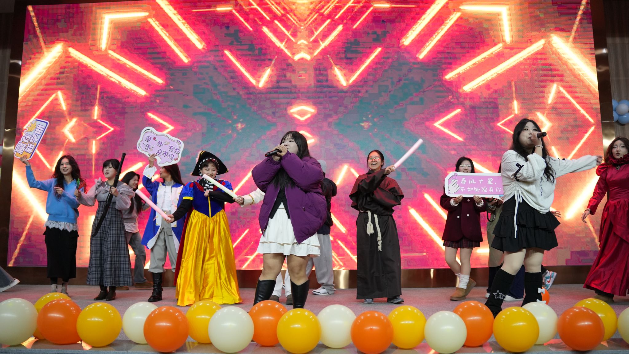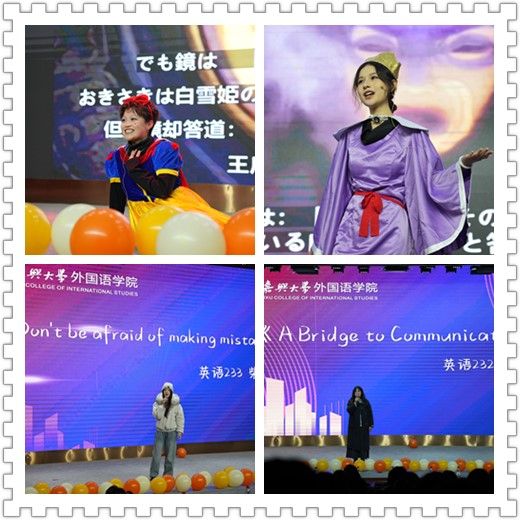 一支充满活力的开场舞迅速点燃全场激情,拉开活动序幕。日语演剧《白雪姬》以流利的日语和精湛的演技重现了经典童话故事,《头脑特工队》、《吹响吧!上低音号》等英语、日语配音作品细腻呈现、惟妙惟肖;“青英杯”英语演讲赛、中华全国日语演讲赛获奖同学经典演讲重现,或激情澎湃、或娓娓道来,展现他们不俗的功力;英语演剧《后妈茶话会》经典复刻,演与说的结合,说与唱的呈现,将现场气氛推向了新高潮;还有舞蹈、朗诵、歌曲串烧,形式多样、精彩纷呈,同学们用生动的表演和真挚的情感,将外语学习的乐趣与魅力展现得淋漓尽致,活动在一曲欢快的全场大合唱《中国话》中划上句号。