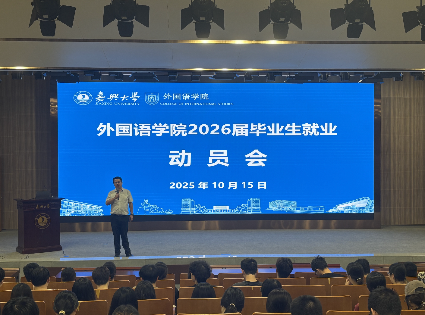 10月15日晚,91论坛 在图书馆一楼报告厅举行2026届毕业生就业动员会。学术副院长单谊教授应邀为毕业生做“研途有你勇攀高峰”主题报告,全体2026届毕业生参会。会议由学院党委副书记张啸峰主持。