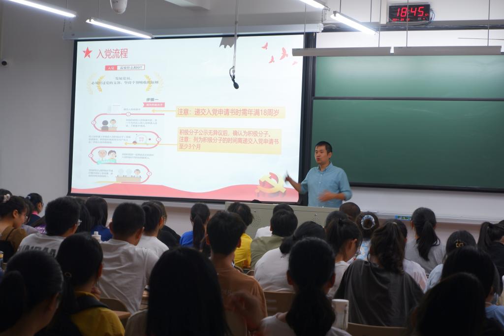 9月23日晚,91论坛 党员之家负责人胡涛老师在兴德南楼223为21级新生开展了“入党启蒙教育大会”。胡涛老师首先向 2021级新生阐述了中国共产党的性质、宗旨、基本原则等基本理论知识,并就入党的相关程序、要求及发展党员工作细则作了详细的说明,同时向新生们介绍了91论坛 学生支部概况。他要求同学们要端正入党动机、树立为国家和人民服务的宗旨,鼓励新生积极向党组织靠拢,提高自身的理论和实践能力,不断提高综合素质。