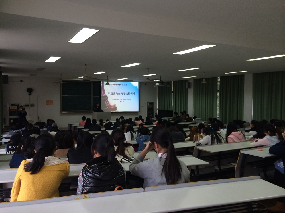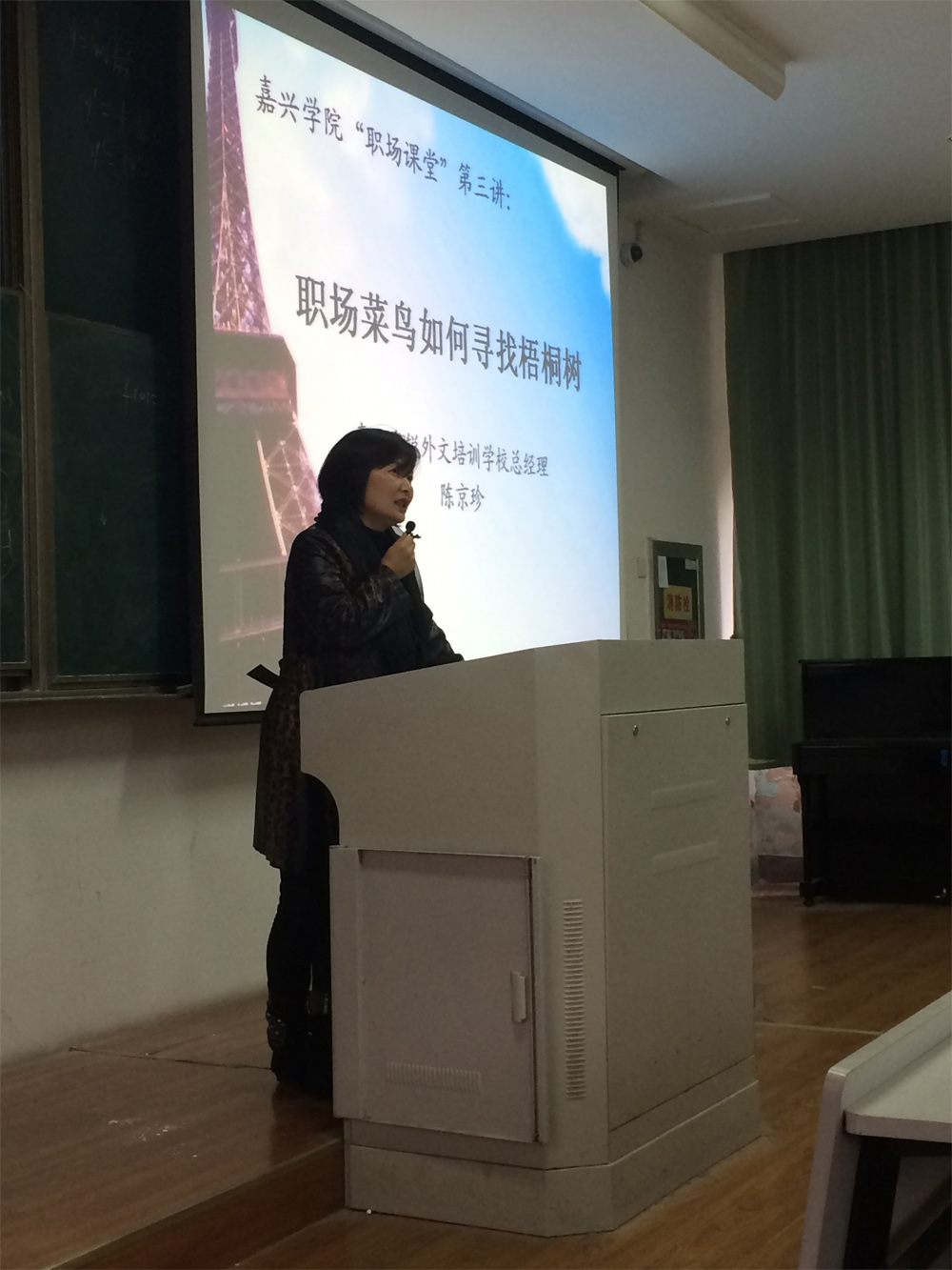 11月27日下午3:30分,由91论坛 承办的嘉兴学院“职场课堂”第三讲在教二A225举行。此次“职场课堂”邀请到了嘉兴市海锐外文培训学校总经理陈京珍主讲。