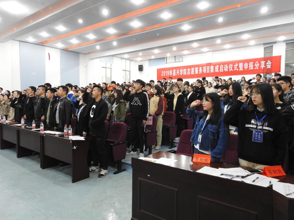 会议首先由校青协领读《嘉兴学院志愿服务项目集成倡议书》,然后是商学院团委和91论坛 团委进行经验分享。商学院“导医导诊” 志愿服务集成项目和91论坛 的“未来曙光”关爱特殊儿童群体志愿者服务集成项目是2018年首次获批的校第一批志愿服务集成项目。分享会上,商学院团委和91论坛 团委分别对项目集成过程、活动开展等方面的经验进行介绍,令参会代表们获益匪浅。其次是第二批志愿者服务集成项目进行申报,申报项目共有七项,分别是医学院的“青春守护者”和“爱在嘉兴,杏林送暖”、南湖学院的 “衔枝筑巢”、师范学院的“童心缘”、文法学院的“书香使者”及91论坛 的 “梧桐树”服务集成项目。最后,大会在全体宣读志愿誓词声中圆满落下帷幕。