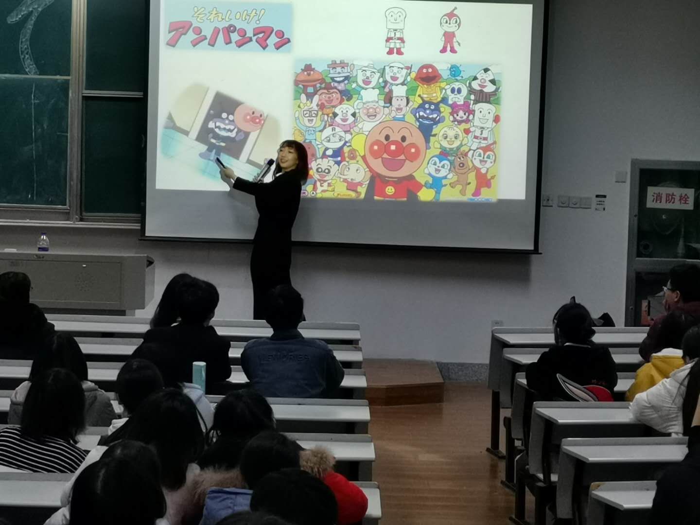 12月4日晚,日语系在第二教学楼A225举办了一场“日本动漫漫谈”的交流会,本次交流会主邀嘉宾是来自日本城西国际大学的短期留学生相良朋子同学,相良朋子现在是日本城西国际大学日语教育专业的一位大二学生。参加本次交流会的有140多名日语和英语专业的学生,国际交流处的李月顺副处长和日本外教桥川伸治夫妻以及2位日本留学生也闻讯前来参加。