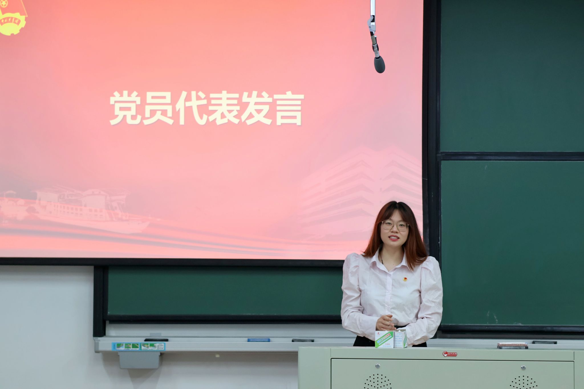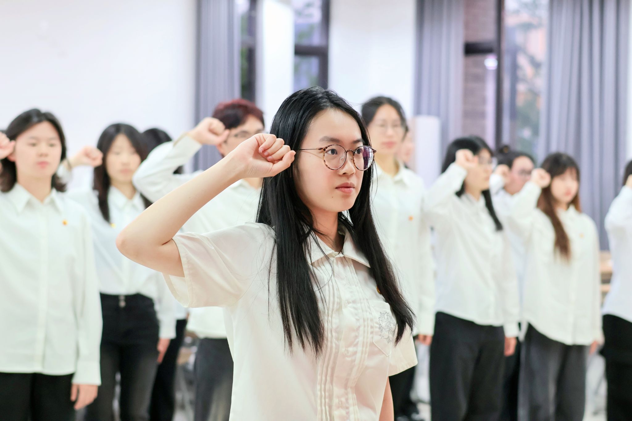 学生团委副书记王艺颖宣读了新发展团员名单,吴琳轩为新发展团员代表佩戴团徽,英语232班林若兮作为领誓人带领新发展团员在团旗前郑重宣誓,表达决心和信念。优秀团员代表英语232林若兮、新团员代表日语231王梅分别在会上发言。