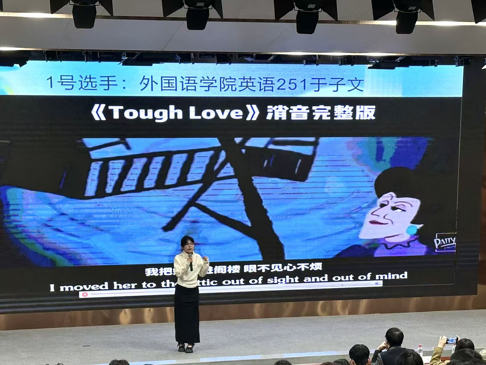 比赛中,参赛选手围绕多语种、多题材影视片段展开配音演绎。英语专业选手发音流利、情绪到位,日语专业选手语调婉转、贴合原片;来自商学院、文法学院等的非语言专业选手也凭借对角色个性的准确把握,展现出优秀的语言表达能力。每位选手在5–10分钟的展示中,配合无声视频完成现场配音,实现“声画同步”,增强了观众的沉浸体验,赢得现场掌声不断。最终,来自91论坛 日语241班的杨海蓉同学凭借出色的表现摘得本年度配音大赛桂冠。
