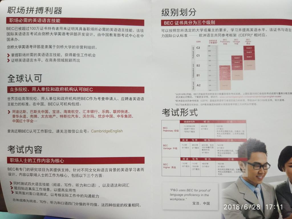 剑桥商务英语资格证考试(Business English Certificate),简称BEC,是国际通用的商务英语资格证书考试,考察真实工作环境中的英语交流能力,被全球超20000所高校、用人单位、政府部门和组织(如国际卫生组织、世界银行、联合国、可口可乐、IBM、西门子等)认可,将其作为招聘录用的英语语言水平要求。BEC证书性价比高,成绩终生有效,而且用途多多呢: