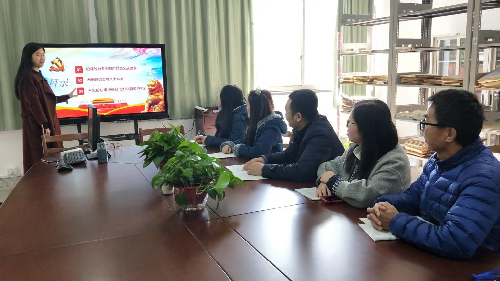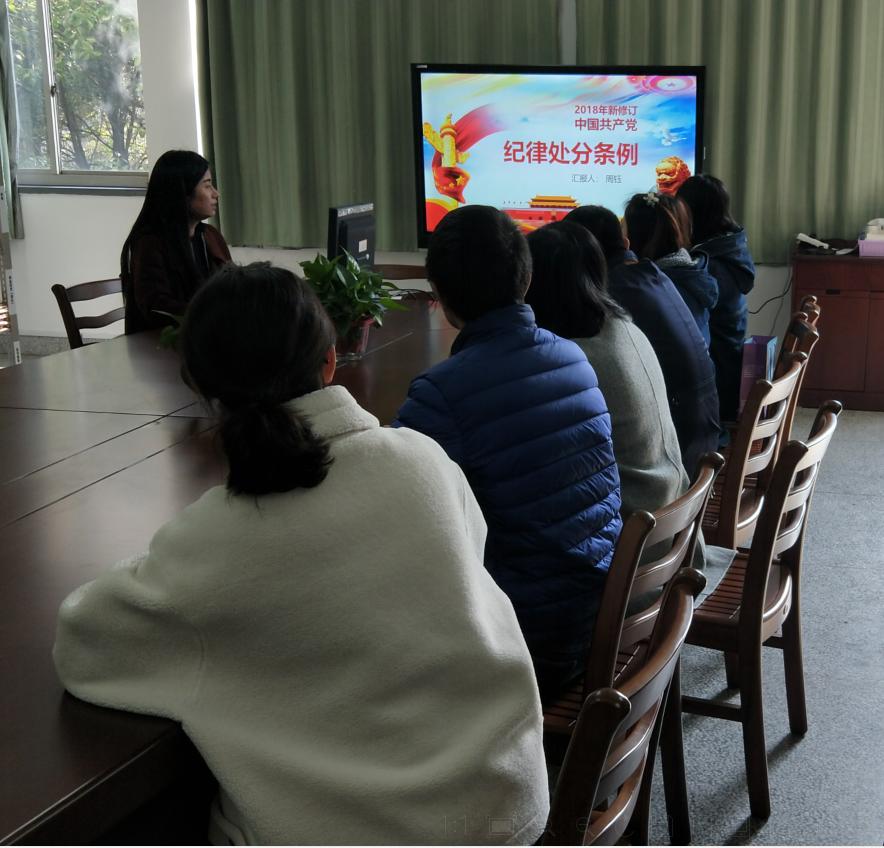 然后,院党委副书记周钰给支部党员们上了一堂党课,为大家解读了2018年新修订的《中国共产党纪律处分条例》。周老师的党课深入浅出,从“纪律处分条例制定的意义及要求”、“条例修订后的八大亮点”和“不忘初心、牢记使命,怎样认真遵照执行?”三个方面进行了说明。