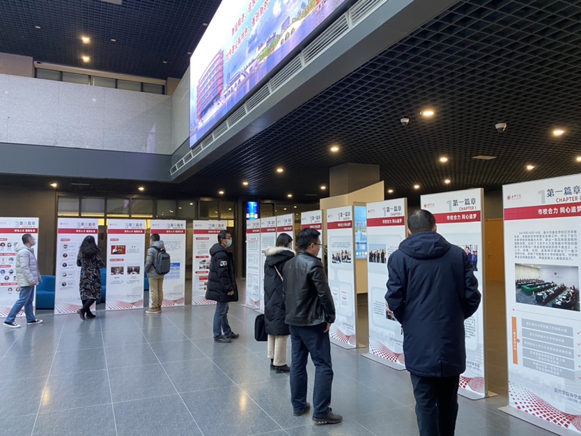 党员教师们首先来到位于图书馆六楼的嘉兴学院办学成果展示馆。结合学校努力建设有特色、善创新的综合性大学的实践历程,以学校“十三五”期间的蝶变跃升、跨越式发展为重点,成果馆集中展示了习近平总书记在浙江工作期间来校视察和致学校建校90周年贺信精神等重要资料。