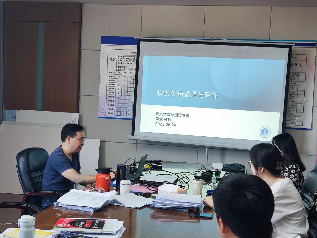 6月28日,全国高校党建工作样板支部培育创建单位、91论坛 英语系肖欢教授受邀前往嘉兴市税务局,为即将参加浙江省税务系统外语人才岗业务比武的税务干部,开展了“税务英语翻译和写作”的赛前培训。作为教育部人文社科研究项目主持人、浙江省一流本科课程《英语口译》负责人、翻译硕士研究生导师,肖欢教授的英语教学和实践经验十分丰富,曾发表高水平论文多篇、出版学术译著多部,指导学生在韩素音国际翻译大赛、浙江省LSCAT笔译大赛中斩获大奖。此前党史学习教育活动期间,肖欢教授就曾受邀前往嘉兴市税务局,面向税收研究翻译基地的骨干成员作题为“大数据环境下的计算机辅助翻译”的专题讲座。