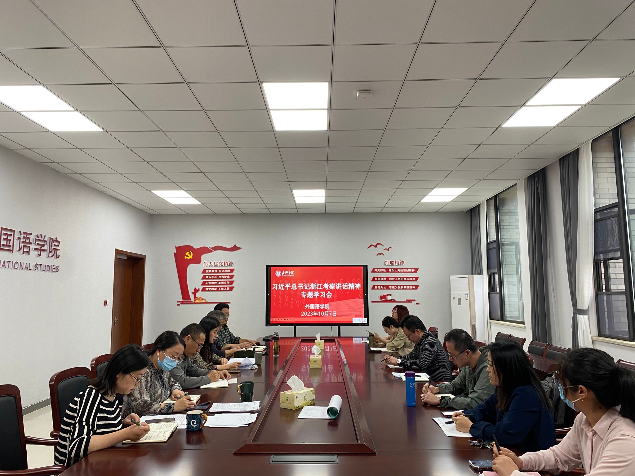 会议强调,要学深悟透习近平总书记考察浙江重要讲话精神,坚定捍卫“两个确立”、坚决做到“两个维护”的政治高度,坚决把思想和行动统一到习近平总书记考察浙江重要讲话精神上来。我们必须提高政治站位、提升政治能力,深刻领悟重大意义和深远影响,形成响亮声势、营造浓厚氛围。要把学习宣传贯彻习近平总书记考察浙江重要讲话精神,作为学院当前和今后一段时期的重要政治任务,在全院范围内迅速兴起学习宣传贯彻习近平总书记考察浙江重要讲话精神热潮,将学习与推进主题教育常态化、长效化结合起来,与贯彻落实习近平总书记在浙江工作期间致学校办学90周年贺信精神结合起来,与聚焦学院中心工作和落实当前重点任务结合起来,融入主责主业,强化实干精神,务求干事实效,做好省级党建工作标杆院系建设、翻译硕士申报、本科教学审核评估、人才培养方案修订等各项工作,把习近平总书记考察浙江重要讲话精神转化为干在实处、走在前列、勇立潮头的磅礴力量,不断推动学院事业高质量发展。
