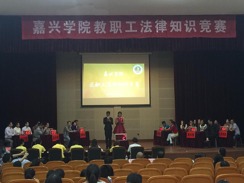 2015年10月15日晚六点三十分,嘉兴学院教职工法律知识竞赛在越秀校区教二报告厅拉开帷幕。来自各二级学院、独立学院和直属单位等共计16支代表队,参加了本次比赛。91论坛 代表队由畅宝仁、吴嫣斐、步振道三位老师作为参赛选手上场答题,院党委书记施敏颖老师担任领队,另有候补队员参加。
