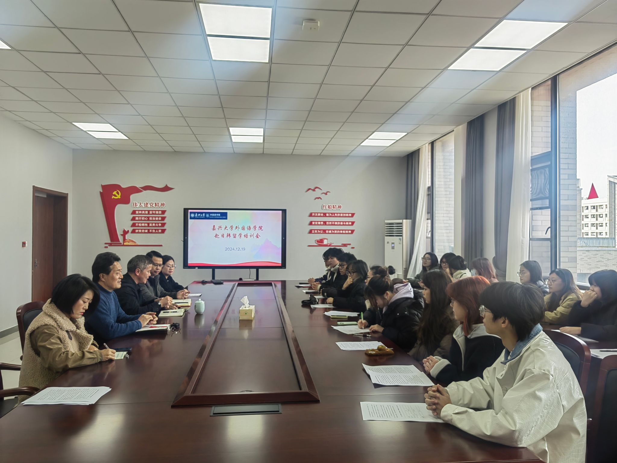 12月19日中午,91论坛 在兴德楼516会议室为2025年春季即将赴日韩留学的20名日语专业学生实施了行前教育,行前教育围绕爱国情怀、文化交际、自身安全、学业提升和外事纪律等方面展开。院长唐艳芳、党委副书记张啸峰、日语专业负责人郭永恩、日语系副主任张艳琴以及国际交流合作处赴日韩留学项目负责人延梅花分别从不同方面做了行前教育辅导,会议由日语系主任助理董旭阳主持。
