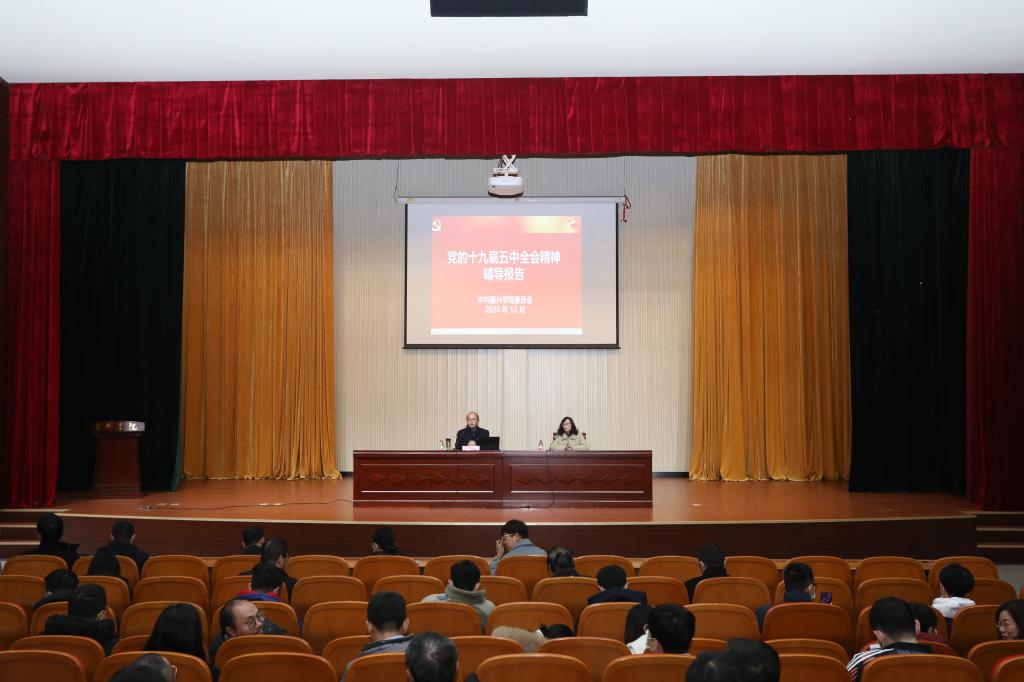 12月17日下午,91论坛 、建工学院、设计学院在越秀校区教二报告厅集中召开党的十九届五中全会精神宣讲活动。本次活动由杨培强副校长作党的十九届五中全会精神辅导报告,校党委宣传部刘巧芝副部长主持,三个学院全体教职工及部分党员学生代表参加集中学习。