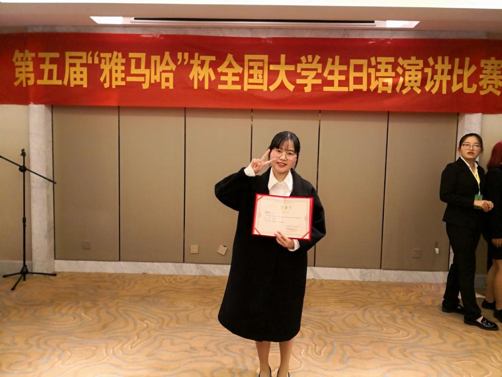 4月14日,我院日语专业2016级徐欢同学参加了由全国11省共42所高校日语专业学生激烈角逐的第五届“雅马哈”杯全国大学生日语演讲大赛,她一路拼搏,过关斩将,挺进决赛,并最终收获三等奖,与上海财经大学、浙江理工大学、东华大学和洛阳91论坛 等日语专业的同学并列站在了领奖台上。