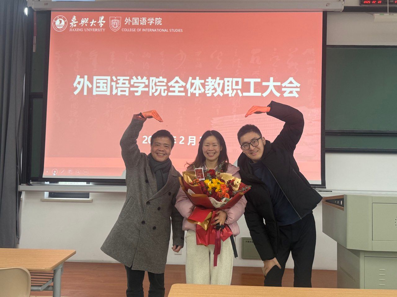 会上,还举行了为退休教师蒋宇红献花的仪式,对蒋老师在外院工作期间的辛苦付出表示感谢,也表达了对蒋老师退休后生活的美好祝福。