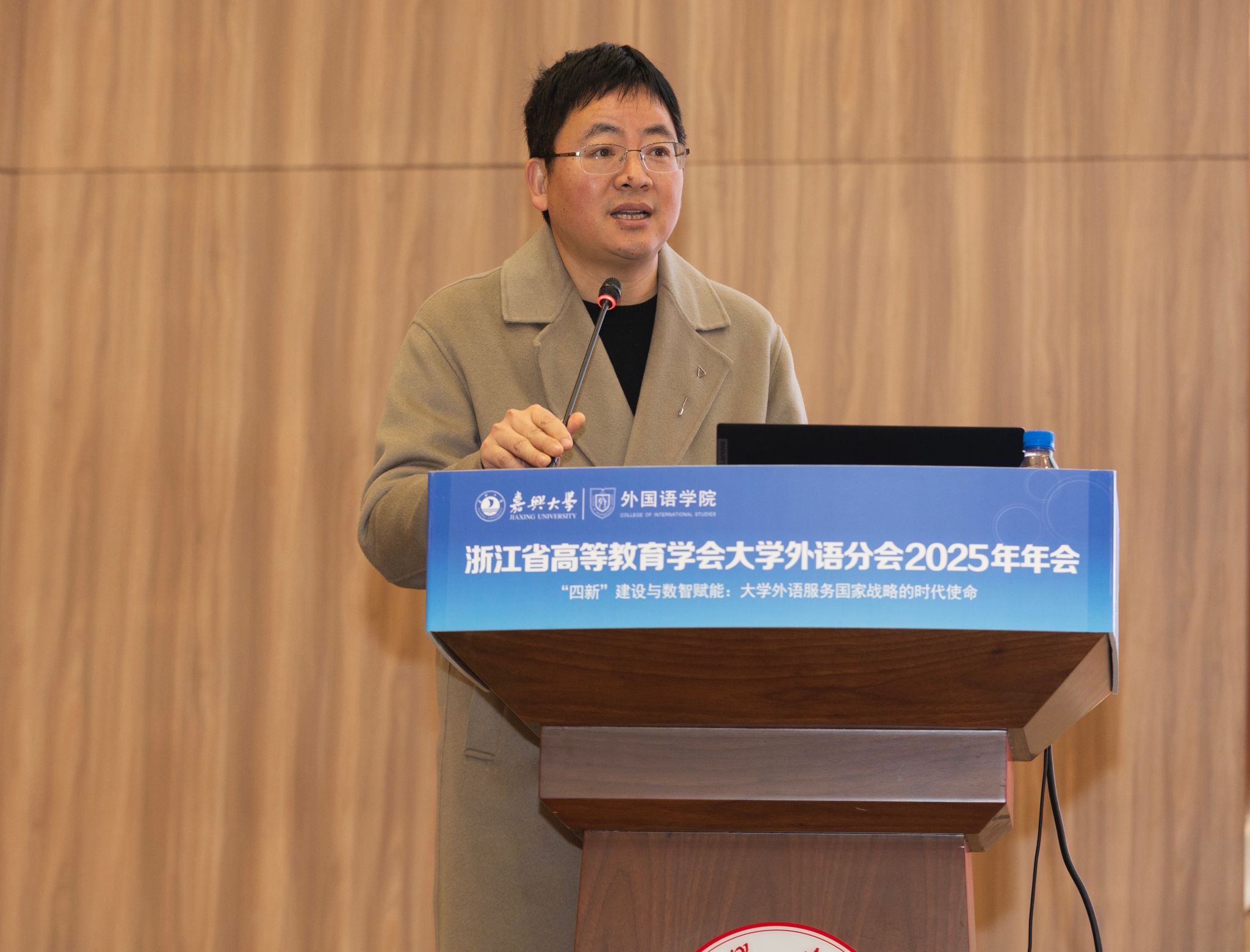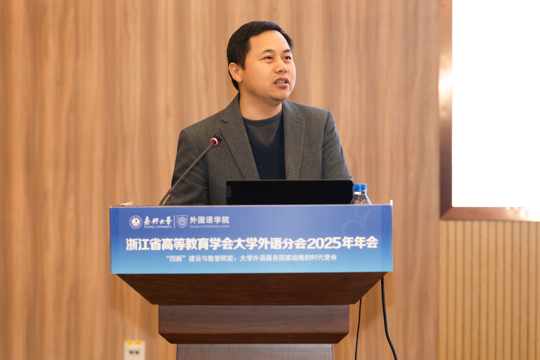 闵尚超在讲话中充分肯定过去一年浙江省高校在外语教学改革方面的积极探索,介绍了省内多所高校将AI技术融入外语教学,聚焦大学外语课程思政建设,依托“理解当代中国”系列教材和赛事,推动思想政治教育与外语教学深度融合,开展复合型人才培养的典型案例,希望大家畅所欲言、深入研讨,把专家的智慧、同行的经验转化为推动大学外语教学改革工作的实际动力。