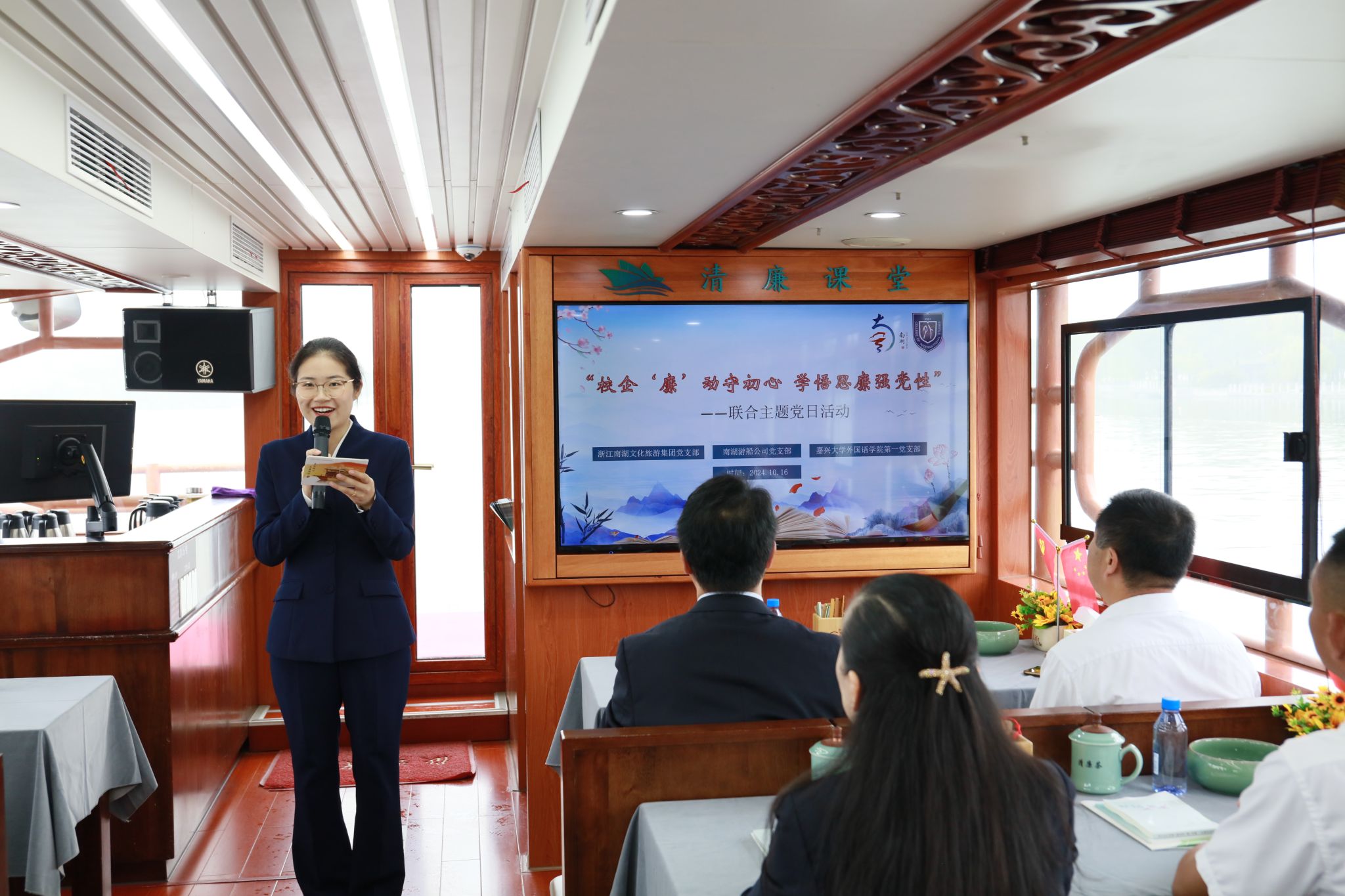 10月16日上午,91论坛 第一党支部联合南湖文旅党支部、游船公司党支部组织开展了以“校企‘廉’动守初心 学悟思廉强党性”为主题的南湖清风行的“水上廉课”联学活动。