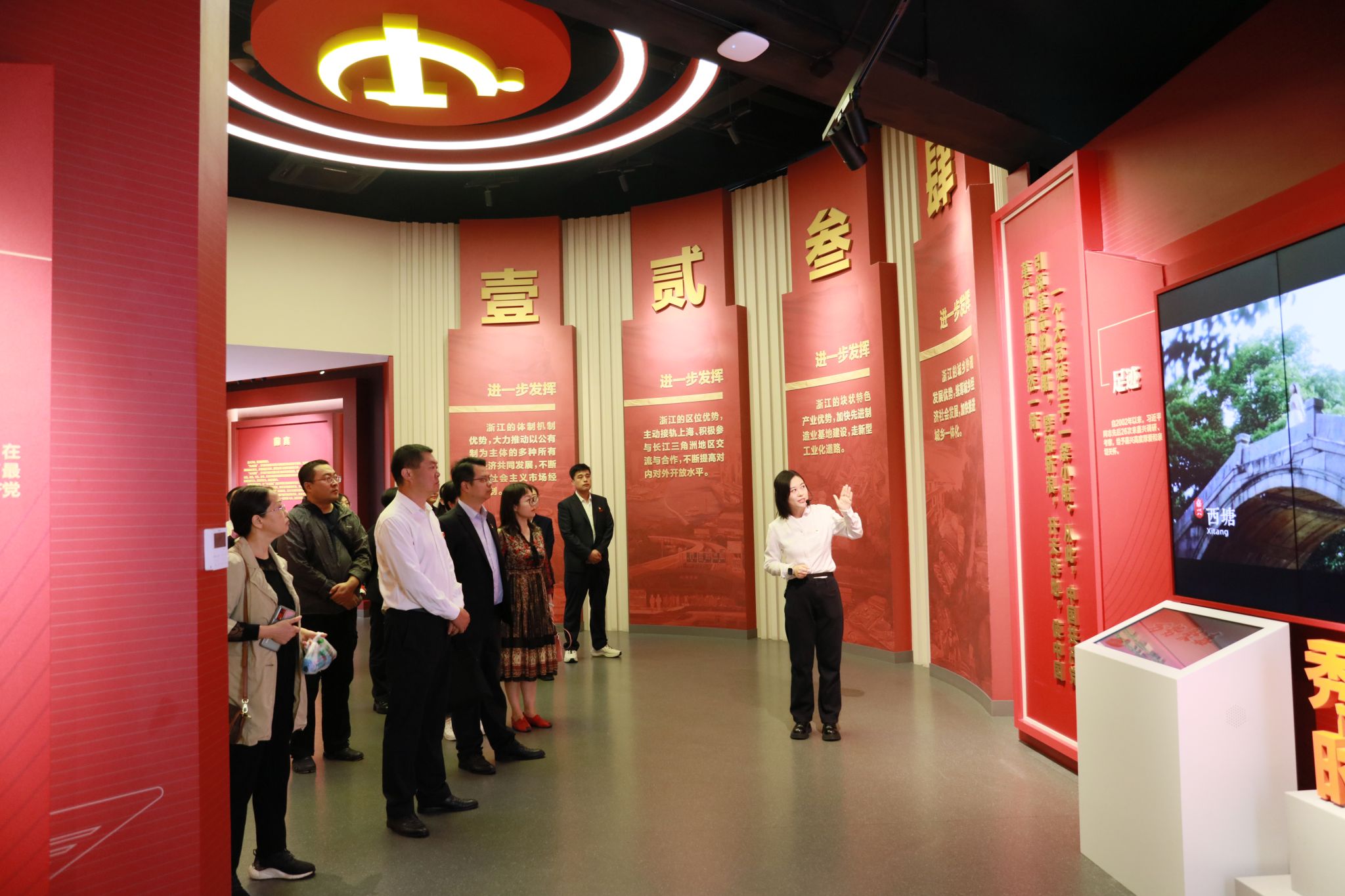 活动伊始,全体与会党员前往南湖革命纪念馆二代馆参观“红船领航——‘八八战略’嘉兴实践主题展”。主题展聚焦“八八战略”市域实践,突出展示“城乡融合看嘉兴”金名片,以最具代表性、影响力、辨识度的元素,全面呈现习近平总书记给嘉兴留下的宝贵思想财富、精神财富和实践成果。参观人员沉浸式感受在“八八战略”指引下嘉禾大地发生的精彩蝶变,为这座城市二十多年来的跨越式发展点赞。