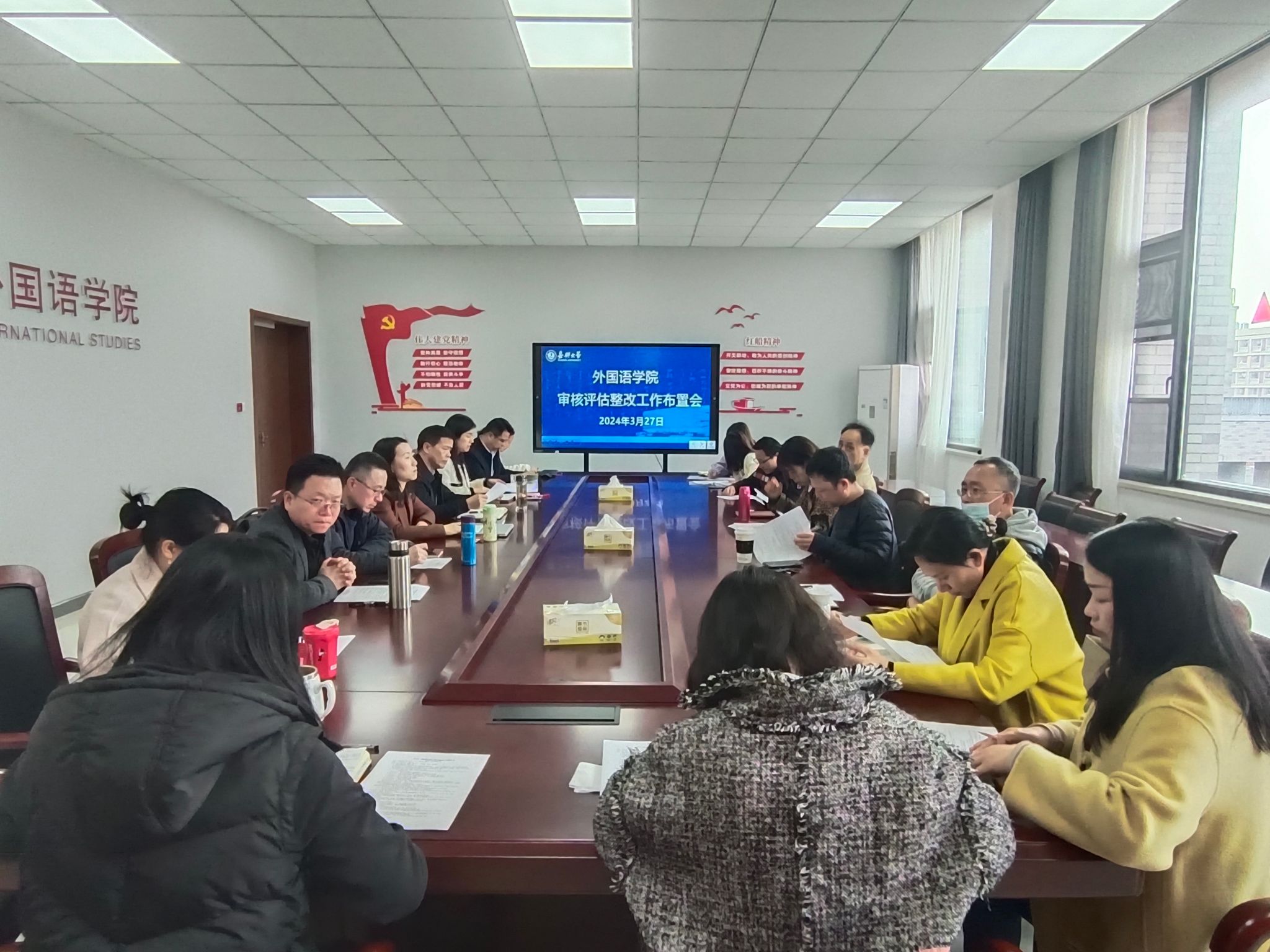 3月27日下午,91论坛 在兴德楼南楼516会议室召开本科教育教学审核评估整改工作布置会。学院党政领导班子成员、专业负责人、系部正副主任、教研室主任、教学督导和教学管理人员参加会议,会议由院长唐艳芳主持。