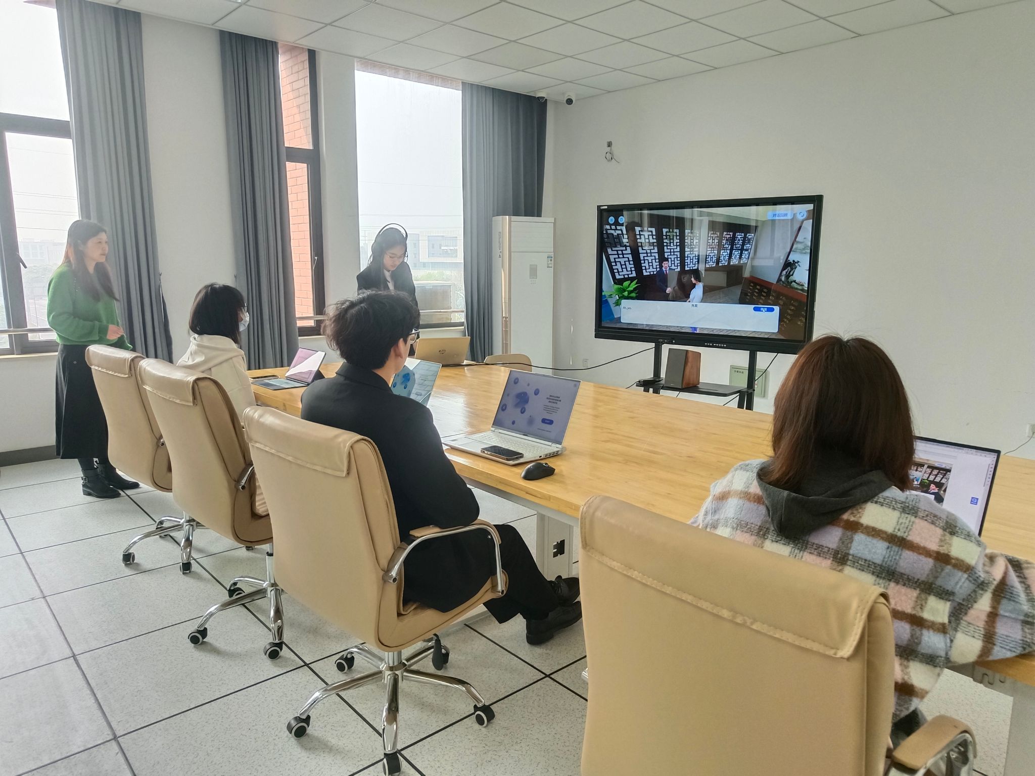 本次检查分为两个阶段。第一阶段为检查阶段,分为两个小组开展检查活动。第一小组听取了学院院长唐艳芳作本科教育教学审核评估工作专题汇报,查看特色材料、制度文件等准备情况,实地考察语言教学实训中心、四六级口语测试室,观看虚拟仿真项目和CFS网络直播间项目展示,并对学院汇报PPT提出了修改意见。第二小组由校督导、二级学院督导和秘书组成,对试卷、毕业论文、教学管理制度、教研活动记录本、教学档案等相关资料的规范性、充分性和合理性进行检查。